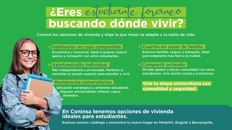Si estás listo para dar el siguiente paso y encontrar tu nuevo espacio, en Coninsa tenemos opciones ideales para estudiantes. Explora nuestro catálogo disponible de vivienda en arriendo y venta de usados en Medellín, Bogotá y Barranquilla, y encuentra el lugar perfecto para vivir esta nueva etapa con tranquilidad y confianza. Lo más importante es recordar que tu vivienda será tu base diaria para estudiar, descansar y crecer, ¡contáctanos hoy!