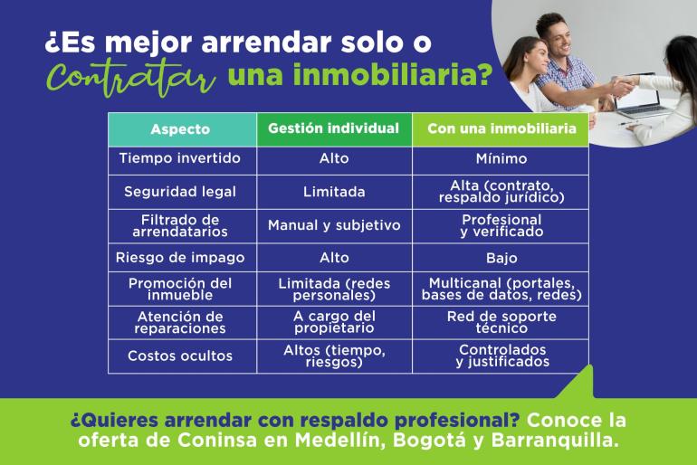 Nosotros utilizamos portales especializados, canales digitales, redes sociales pagas y nuestra base de clientes para promocionar la propiedad. Esto genera mayor flujo de visitas, más interesados calificados y, por lo tanto, menores tiempos de vacancia. En Coninsa contamos con una red propia de comercialización y atención en Bogotá, Antioquia y la Costa Atlántica, lo que amplifica la exposición del inmueble ante públicos activos y reales, ¡le mostramos tu propiedad a las personas indicadas!