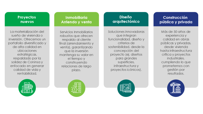 En Coninsa hemos evolucionado hacia un modelo de ecosistema integral de servicios diseñado para acompañar y agregar valor en cada fase del ciclo de vida de un proyecto y el hábitat. Este modelo no solo optimiza procesos, sino que también ofrece un soporte completo a todos los actores intervinientes: